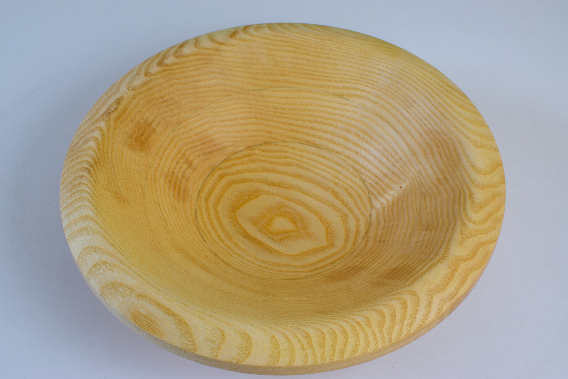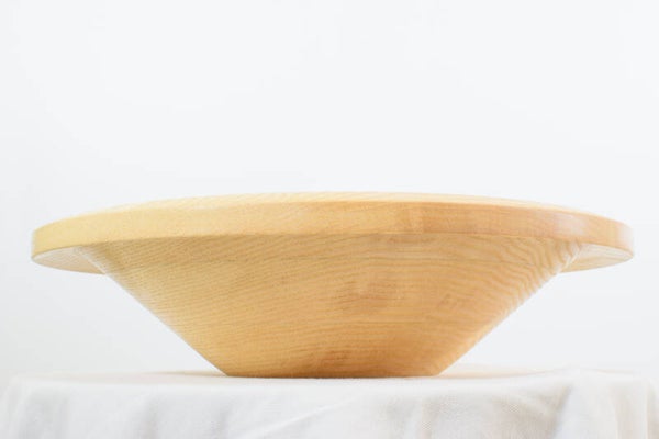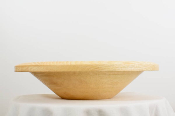 | Bijzonderheden | Uit een plank van plm 2,5 cm zijn drie ringen schuin uitgesneden en vervolgens op elkaar gelijmd; daardoor onstaat een dikkere plank waaruit de schaal is gedraaid. |